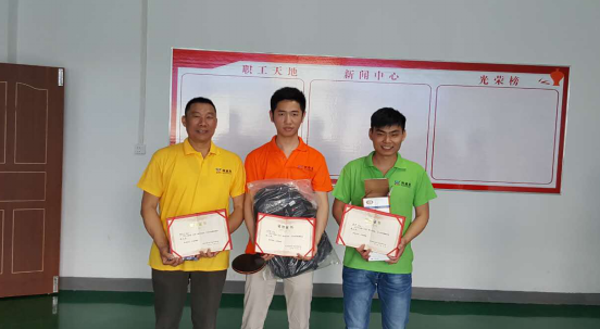 個人乒乓球比賽每個組派兩名選手,實行淘汰制晉級方式,抽簽分組決定比賽順序。乒乓球作為我國的國球,在民間的普及度是較高的。公司為了豐富員工的業(yè)余文化生活,成立了員工活動中心,為廣大員工提供了一個相互交流、切磋球技的機會。雖然同事們都沒有經(jīng)過專門的訓(xùn)練,但也都能信手拈來。比賽現(xiàn)場不時傳來熱烈的喝彩聲,興奮的“好球”聲不斷。本次比賽的第一名是王李波;第二名是熊波;第三名是陶總。